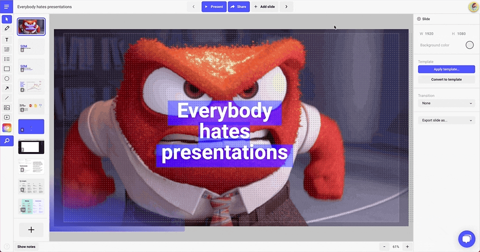 - You couldn’t work together on the same slide at the same time, which was okay(ish) for small teams, but it turned out to be a real pain for bigger teams.