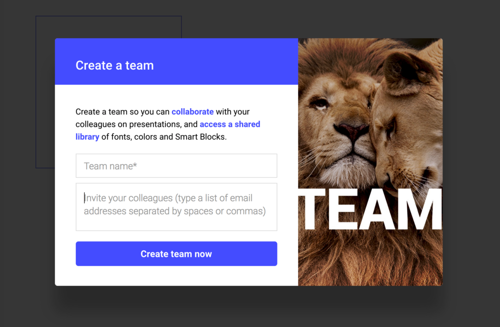 The Team plan gives you access to a common dashboard with all your colleagues, which will allow all the members of your team to work on the same presentations. Apart from having access to the same dashboard, you’ll also share colors, files, fonts and Smart Blocks. It’s perfect for collaboration! And if you sometimes need to work on personal presentations, that’s not a problem as you’ll always have access to your individual account (either Free or Pro).
